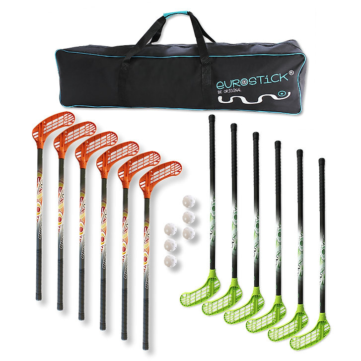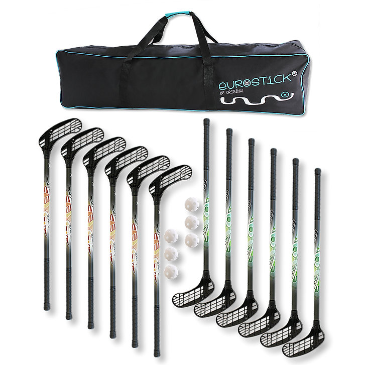 Sada 12 florbalových palíc a 6 loptičiek dodávaná s praktickým batohom.